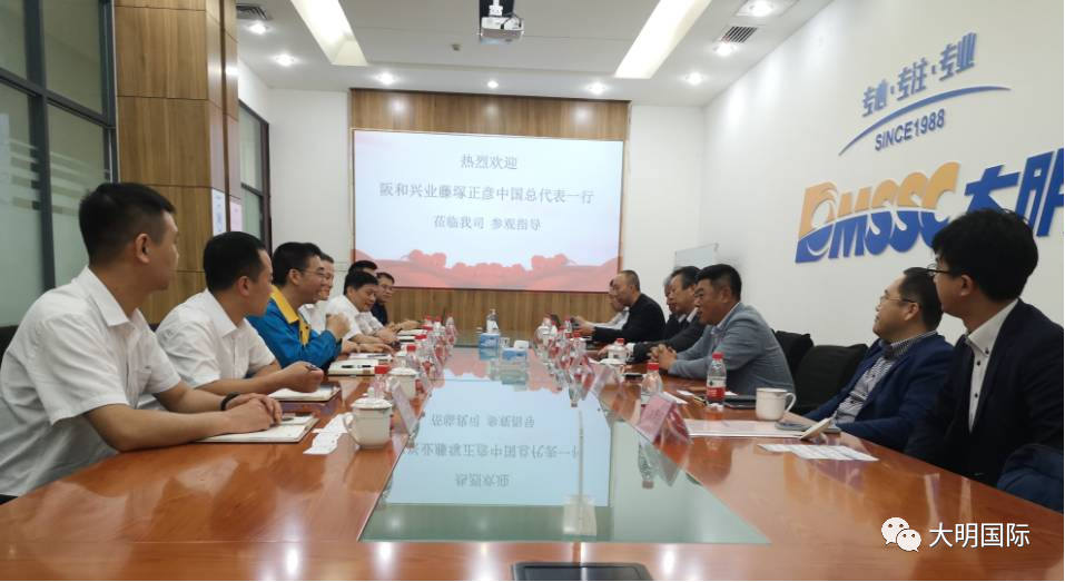 6月2日,阪和興業(yè)(上海)管理有限公司中國總代表藤塚正彥、董事長特別助理米原佳彥、阪和(大連)總經(jīng)理劉鐘男等領導率阪和上海、天津、大連團隊一行7人來訪大明天津加工中心。大明天津加工中心總經(jīng)理于長江、副總經(jīng)理夏紅衛(wèi)、副總經(jīng)理張帆等熱情接待并座談交流。