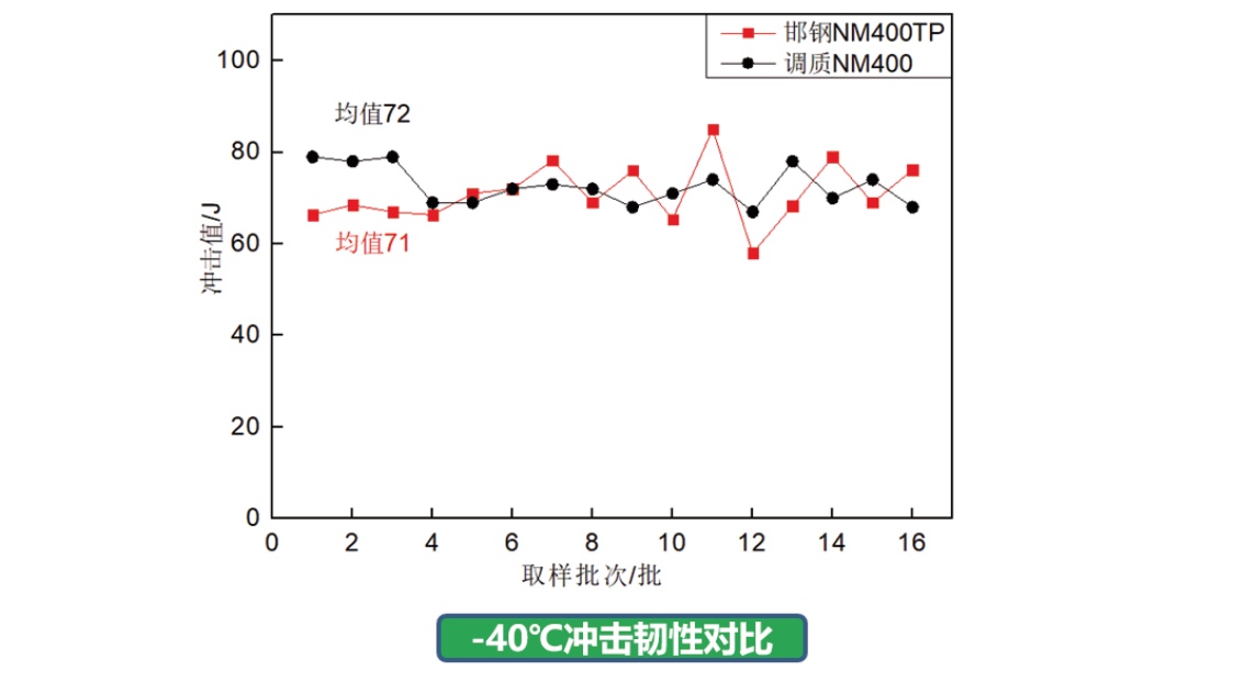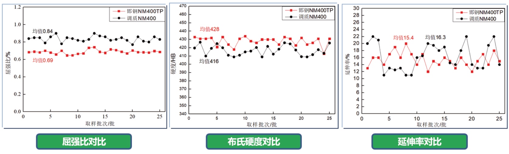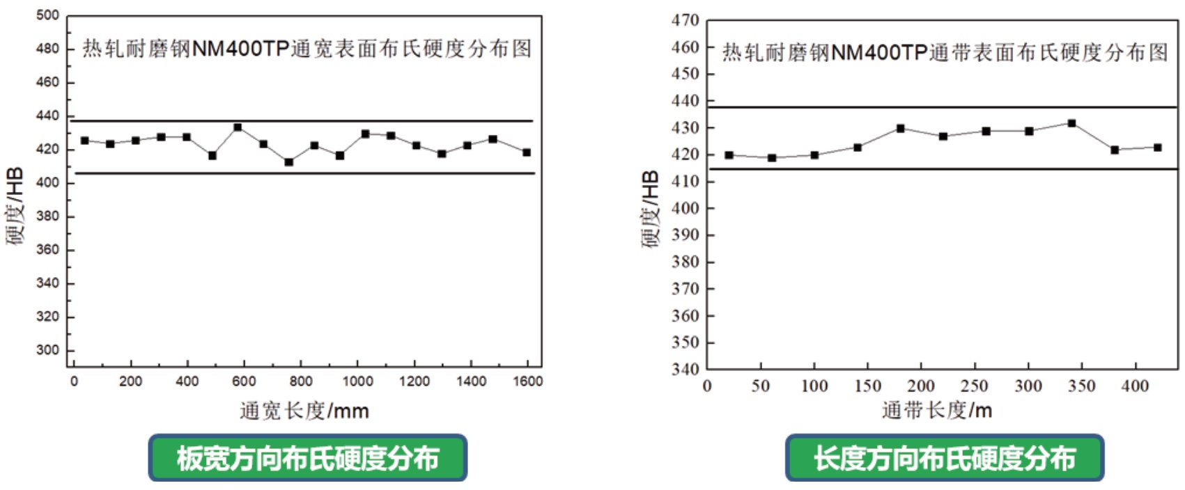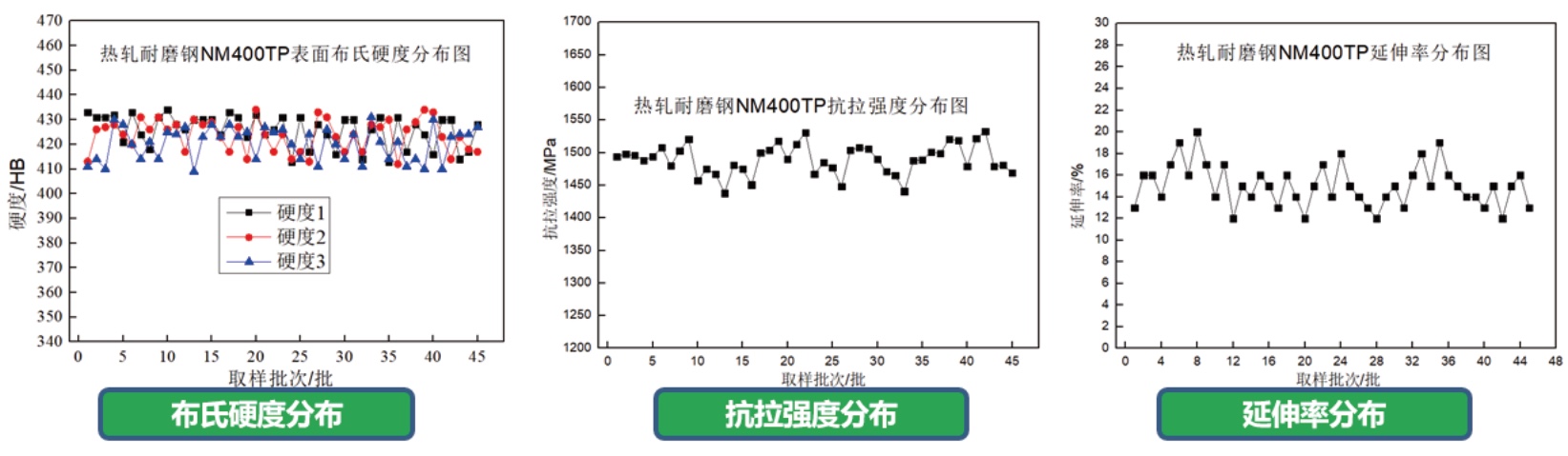 NM400TP性能分布情況(45個批次):布氏硬度高度均勻,波動<±15HBW,均勻磨損,保證使用壽命??估瓘姸取?400MPa,延伸率>11%,保證馬氏體超高強耐磨鋼的加工、成型性能。